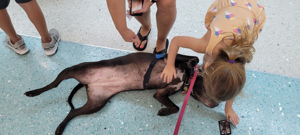 Our previous dog, Roxie, and I served as a pet therapy team for about five years. We traveled to hospice facilities, the local hospital, schools, and the Jacksonville International Airport. Our visits were never about me; the focus was on the people. They wanted to love on Roxie—and she truly enjoyed that! The main point was the people in the room. Many times, as people rubbed Roxie’s belly, they began talking about their own dog, their illness, their joy, or their anxiety. The visit was about them—a moment to pause for smiles, comfort, and peace. WeTones!